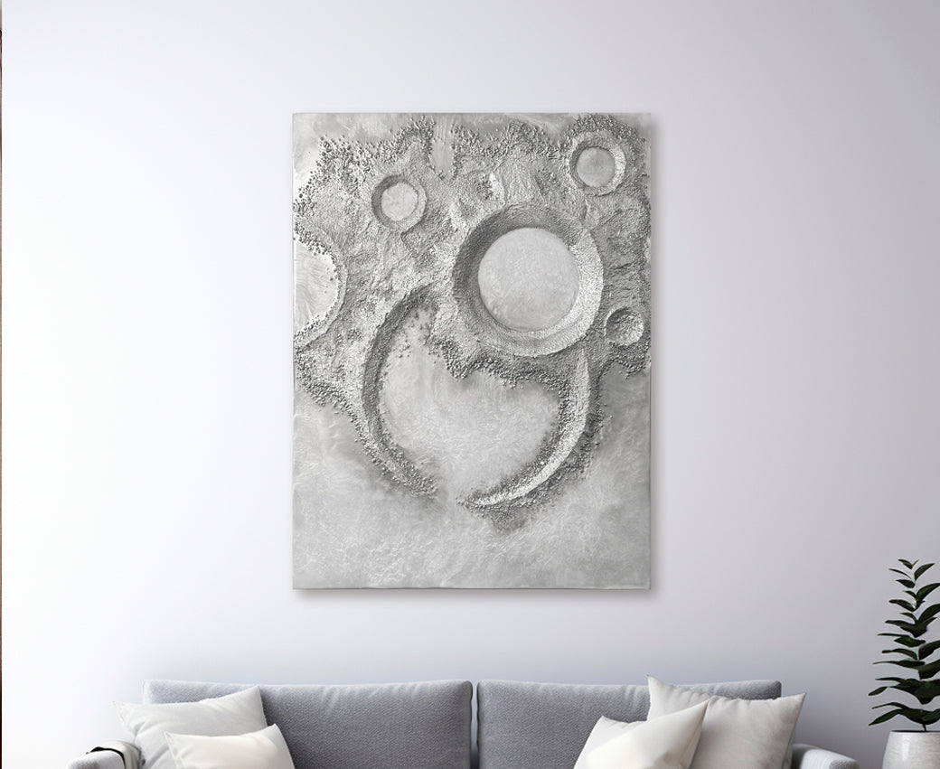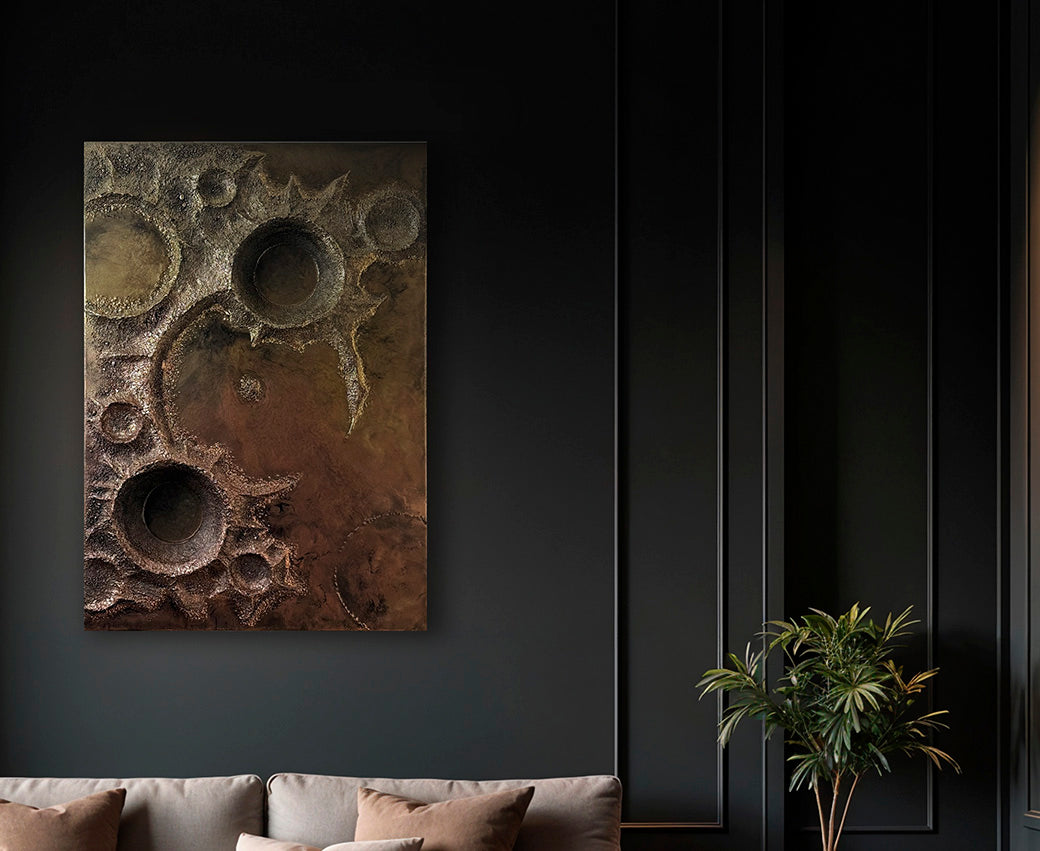 Anton Pogarskiy's textured artworks are more than paintings — they are sculptural experiences born from cosmic inspiration. Each piece is a one-of-a-kind creation, handcrafted with a unique authorial technique that blends metallic leaf, pigments, and resin into luminous depth.