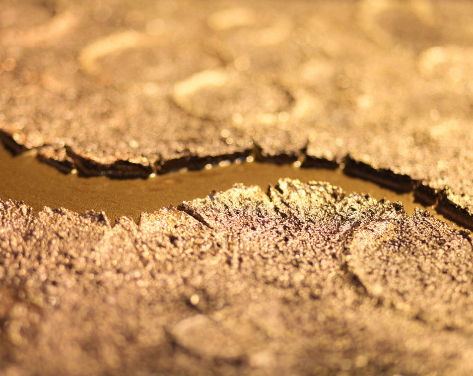 His layered textures evoke cratered terrains, ridged dust plains, and cosmic erosion, rendered in stunning detail through a mix of metallic leaf, pigments, and resin.