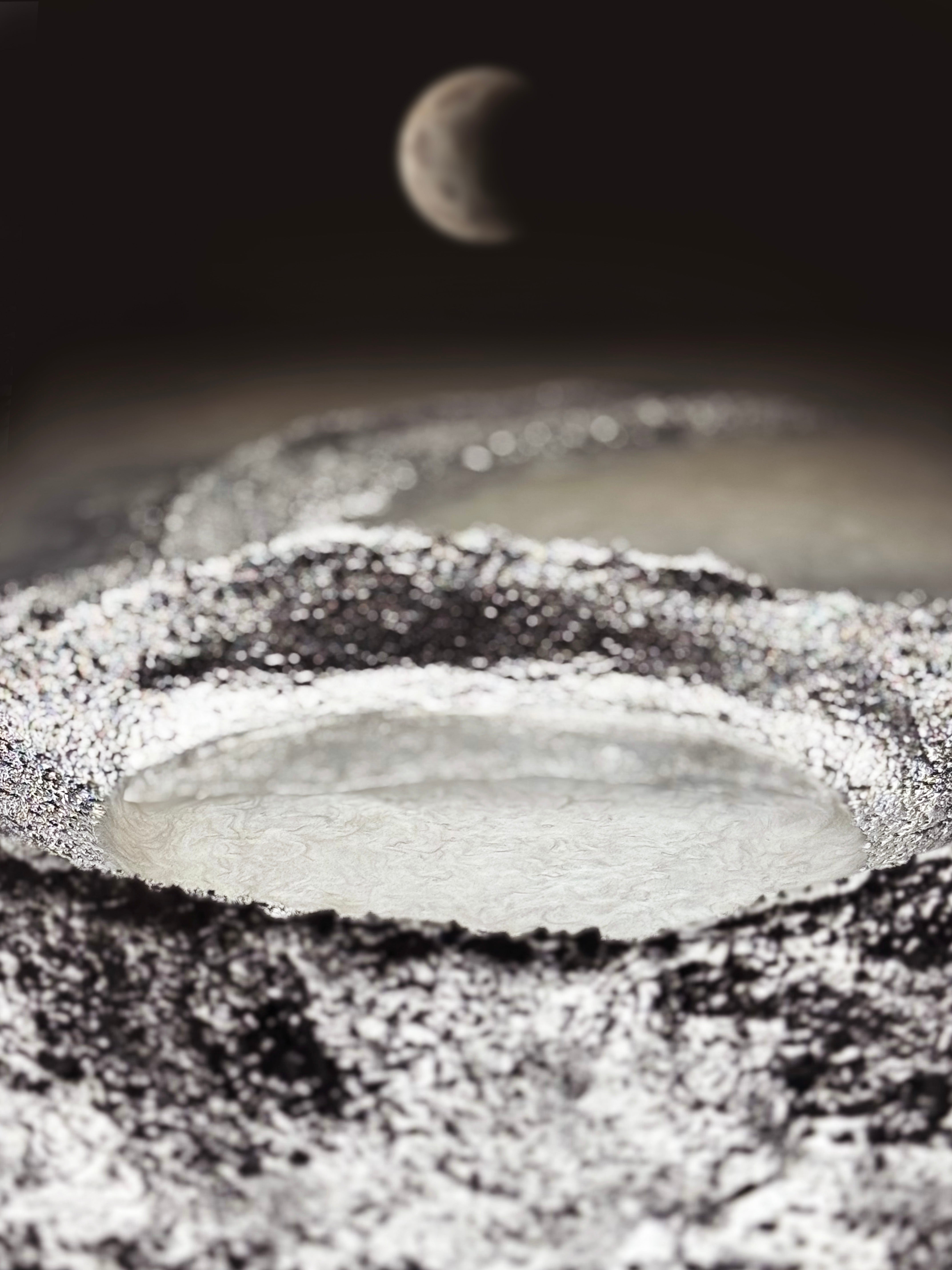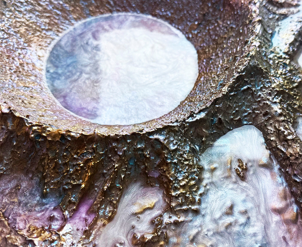 Texture is at the heart of every artwork. Multilayered surfaces resemble the rugged terrain of the Moon — with cracks, craters, and traces of cosmic energy and time.
